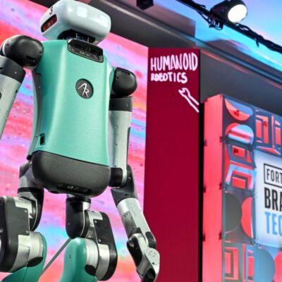 Digit, the flagship robot at Oregon-based Agility Robotics, raised its hand to wave at the audience at the Fortune Brainstorm