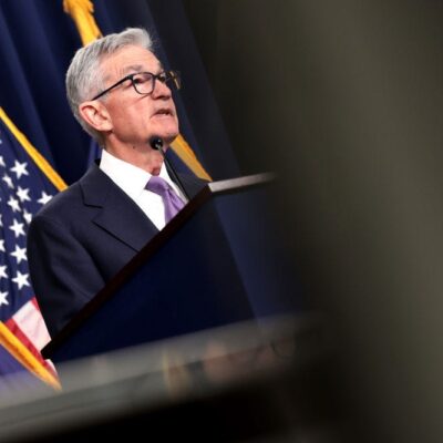 U.S. Federal Reserve Board Chairman Jerome Powell arrives at a news conference at the headquarters of the Federal Reserve on