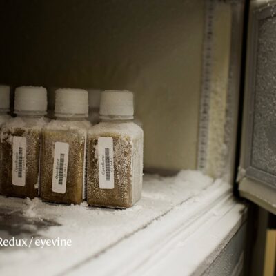 Samples that will be used in faecal microbiota transplants, which can enhance responses to cancer immunotherapy, sit in a freezer.Credit: