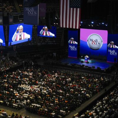 NEW YORK (RNS) — Waving both the tri-color Indian flag and the American Stars and Stripes, more than 13,000 people